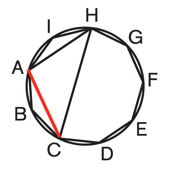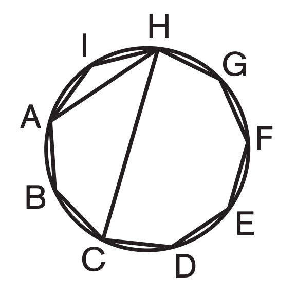 MATHCOUNTS 2016-2017 – 231 Regular nonagon ABCDEFGHI is inscribed in a circle, as shown. What is $m\angle{AHC}$? Click here to show the solutions.