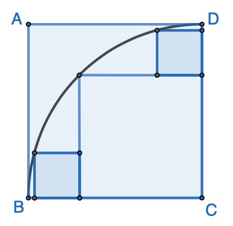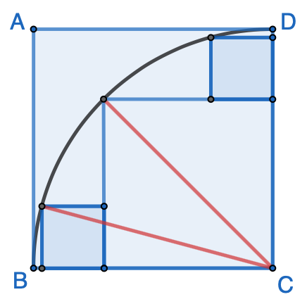 As shown in the following figure, a quarter circle is drawn in a unit square, and 3 smaller squares are inscribed inside the quarter circle. Find the total area of the 3 smaller squares. Click here for the hint.