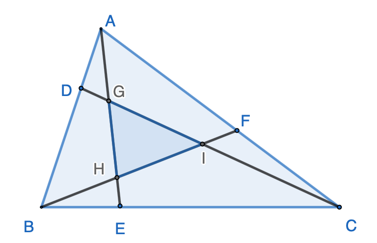 In $\triangle ABC$, $\dfrac{AD}{BD} = \dfrac{1}{2}$, $\dfrac{BE}{EC} = \dfrac{1}{3}$, and $\dfrac{AF}{CF} = \dfrac{3}{2}$. What is the ratio of the area of $\triangle GHI$ to $\triangle ABC$?