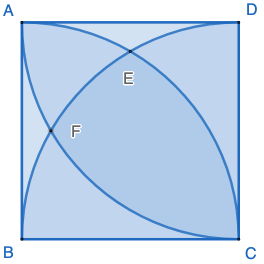 In fact, based on the calculations in the previous posts in this series, we have: $$ [AEF]=1−[BCD]−[ADE]−[ABF] $$ $$ =1-\dfrac{\pi}{4}-2\cdot(1-\dfrac{\sqrt{3}}{4}-\dfrac{\pi}{6})=\dfrac{\pi}{12}+\dfrac{\sqrt{3}}{2}-1 $$