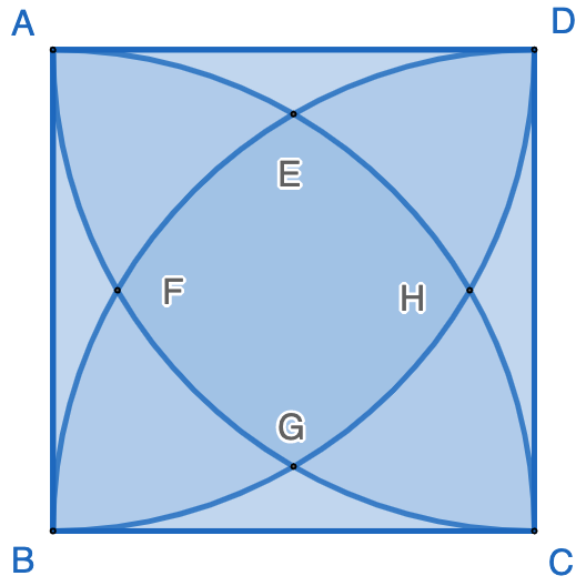 If one more quarter circle is added, shown as the following figure, what is the area of the region in the middle bounded by arc $\stackrel \frown{EF}$, $\stackrel \frown{FG}$, $\stackrel \frown{GH}$, and $\stackrel \frown{HE}$?