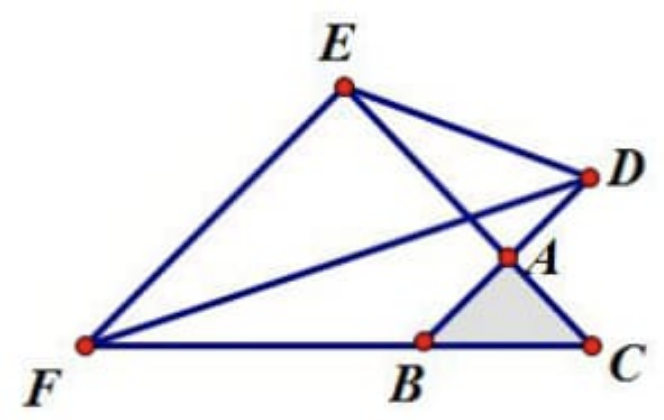 ________ The area of $\triangle{ABC}$ is $10\ cm^2$. $BA$ is extended to $D$ so that $DB=AB$. $CB$ is extended to $E$ so that $EA=2 AC$. $CB$ extended to $F$ so that $FB=3 BC$. Find the area of $\triangle{DEF}$ in $cm^2$.