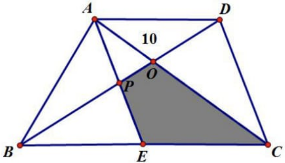 ________ In trapezoid $ABCD$, $AD\parallel BC$. $AD=BE=EC$. $BD$ intersects with $AC$ at $O$, and $AE$ at $P$. The area of $\triangle{AOD}$ is $10\ cm^2$. Find the area of quadrilateral $OPEC$ in $cm^2$.