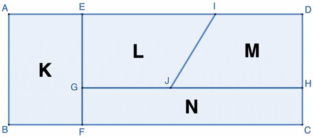 ________ Rectangle $ABCD$ is divided into 4 smaller regions, $K$, $L$, $M$, and $N$, with equal area. If the ratio of the length and the height of rectangular region $K$ is $\dfrac{3}{2}$, what is the ratio of the length and the height of rectangular region $N$? Express your answer as a common fraction.