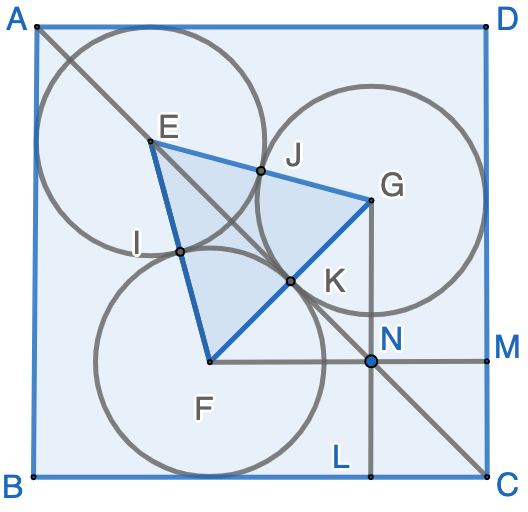 Assume the radius of the circles is $r$. Obviously, $\triangle{EFG}$ is equilateral as $$\overline{EF}=\overline{FG}=\overline{GE}=2\cdot r$$ Therefore, $$\overline{EK}=\dfrac{\sqrt{3}}{2}\cdot\overline{FG}=r\cdot\sqrt{3}$$ Since $$ \overline{AE} + \overline{EK} + \overline{KN} + \overline{NC} = \sqrt{2}$$ we have $$r\cdot\sqrt{2} + r\cdot\sqrt{3} + r + r\cdot\sqrt{2}=\sqrt{2}$$ Therefore $$r=\frac{\sqrt{2}}{1 + 2\sqrt{2}+\sqrt{3}}=\frac{2}{4+\sqrt{2}+\sqrt{6}}$$ $$ = \frac{1}{2}(8-5\sqrt{2}+4\sqrt{3}-3\sqrt{6}) \approx 0.2543331$$