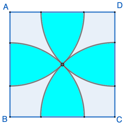 In the following figures, 4 quarter circles join at the center of a unit square. Find the area of the shaded regions in blue.