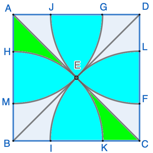 It is obvious that the radius of each quarter circle is $\dfrac{\sqrt{2}}{2}$, and the area of two green regions is: $$\dfrac{1}{2}-\dfrac{1}{4}\cdot\pi\cdot(\dfrac{\sqrt{2}}{2})^2=\dfrac{1}{2}-\dfrac{\pi}{8}$$ Therefore, the total area of the blue regions is equal to the area of the unit square minus 4 times of the area of the two green regions: $$1-4\cdot(\dfrac{1}{2}-\dfrac{\pi}{8})=\dfrac{\pi}{2}-1$$