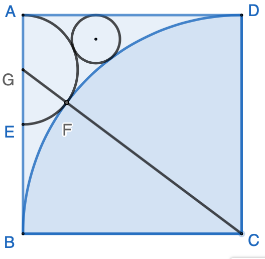 Therefore, both $\triangle{GLH}$ and $\triangle{CJH}$ are right triangles. According to Pythagoras theorem, we have: $$\overline{GL}^2+\overline{HL}^2=\overline{GH}^2,\ \ \ \overline{CJ}^2+\overline{HJ}^2=\overline{CH}^2$$ Based on the result of the previous post in this series, the radius of the semi-circle is $\dfrac{1}{4}$. Additionally, since point $C$ is the center of the quarter circle and point $G$ is the center of the semi-circle, both of them are tangent with the full circle centered at point $H$, by assuming the radius of the full circle is $r$ and $\overline{GL} = t$, we have: $$\overline{GH}=\dfrac{1}{4}+r,\ \ \ \overline{HL}=\dfrac{1}{4}-r$$ $$\overline{CH}=1+r, \ \ \ \overline{CJ}=1-t. \ \ \ \overline{HJ}=1-r$$ Therefore, we have the following equations: $$t^2+(\dfrac{1}{4})^2=(\dfrac{1}{4}+r)^2$$ $$(1-t)^2+(1-r)^2=(1+r)^2$$ Simplify the above equations, we have: $$t^2=r, \ \ \ (1-t)^2=4r$$ We have two solutions $$t=\dfrac{1}{3}, \ \ \ r=\dfrac{1}{9}$$ $$t=−1, \ \ \ r=1$$ By ignoring invalid answer $r=1$, we have the answer $r=\dfrac{1}{9}$.
