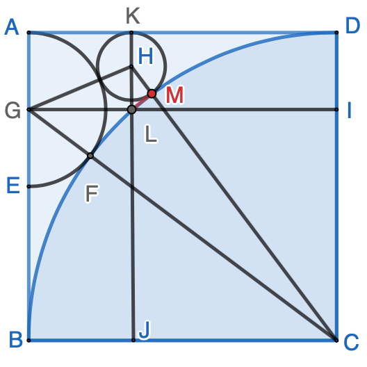Continue the same topic of the previous post in this series, a line is drawn between point L and the tangent point M between the full circle and the quarter circle, as shown in the following figure. Prove $\triangle{HLM}$ is a right triangle.