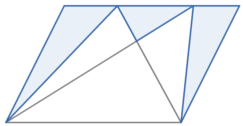 25. The area of the parallelogram shown is $44$. If the total area of the shaded region is $14$, what is the area of the region common to the two large unshaded triangles that share a common base?