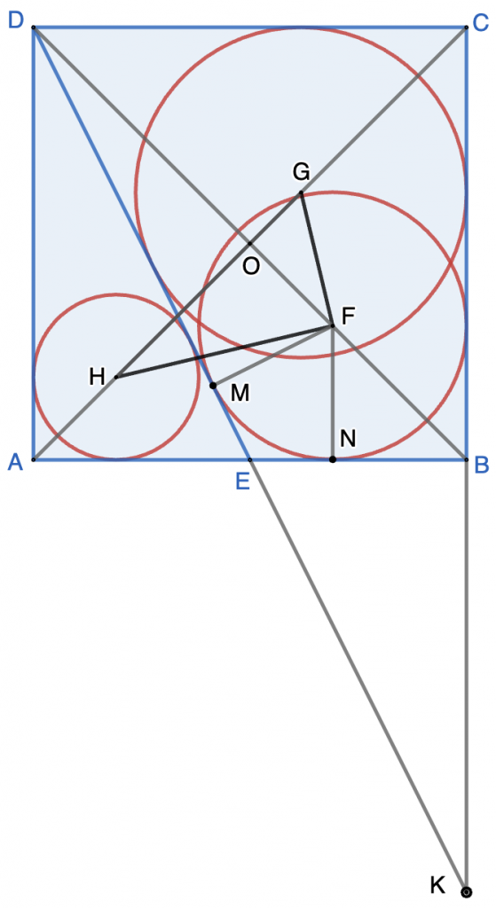 Proof: Extend $DE$ and $CB$ so that they intersect at $K$. Draw diagonals of $ABCD$ so that they intersect at $O$. Let $M$ and $N$ are tangent points of circle $F$ on $DE$ and $AB$ respectively, we have $FM\perp DE$ and $FN\perp AB$. Additionally, without loss of generality, we assume that $ABCD$ is a unit square. It is obvious that $F$ is on $BD$, $G$ and $H$ are on $AC$.