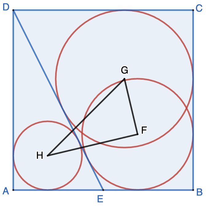 As shown in the figure, $ABCD$ is a square, $E$ is the mid-point of $AB$. The circle with its center at $H$ is tangent with $AD$, $AE$ and $DE$. The circle with its center at $F$ is tangent with $BC$, $BE$ and $DE$. The circle with its center at $G$ is tangent with $BC$, $CD$ and $DE$. Prove that $\triangle{FGH}$ is a right triangle. Click here for the proof.