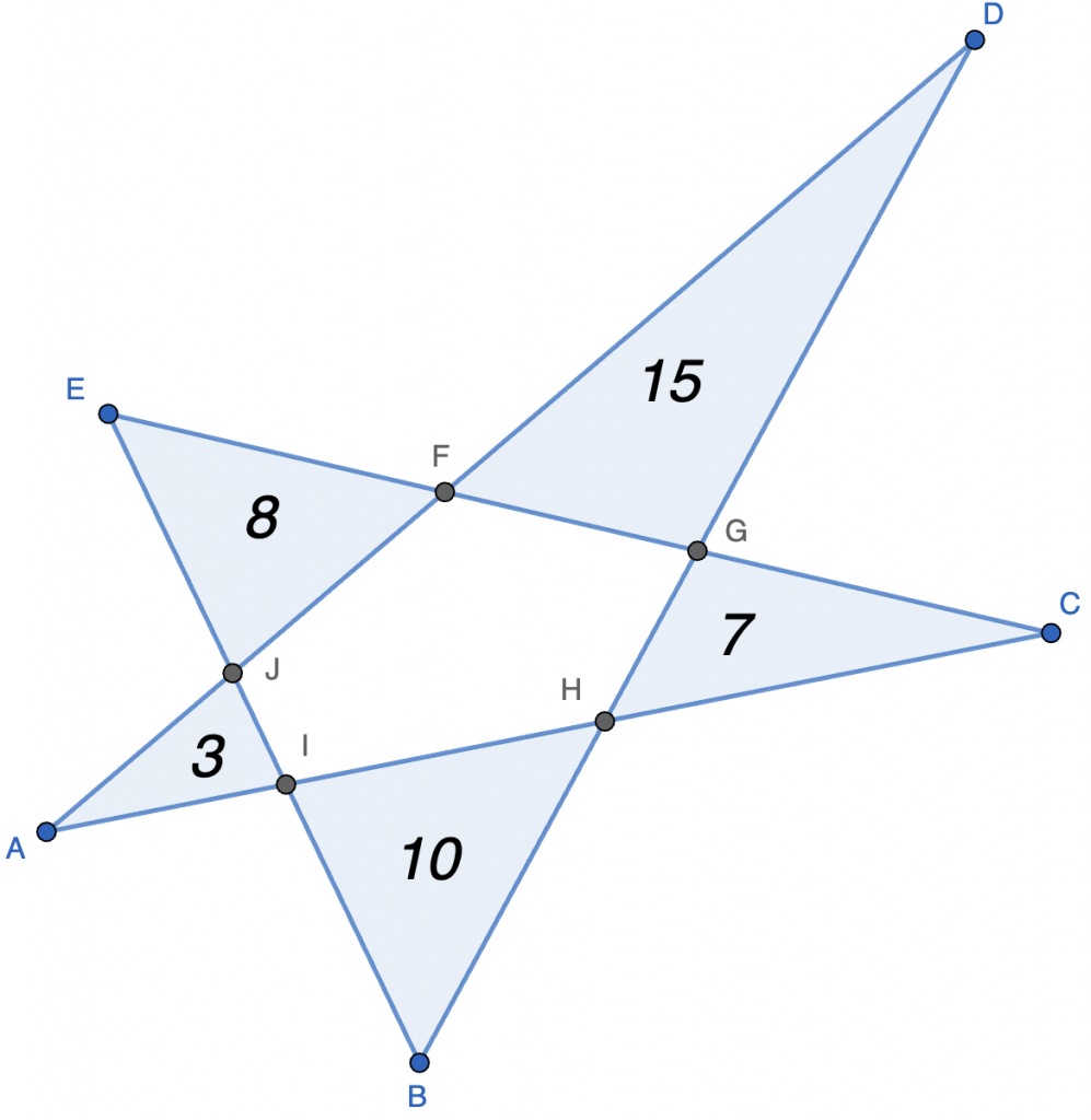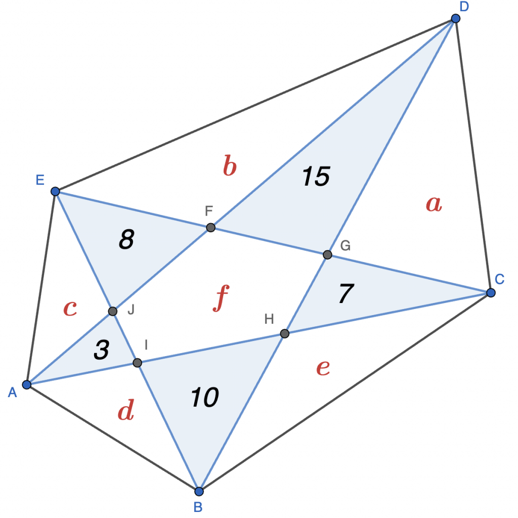 Solution: Draw line AB, BC, CD, DE, EA, and label the area of $5$ newly formed triangles as $a$, $b$, $c$, $d$, and $e$ respectively. Additionally, label the area of the pentagon $FGHIJ$ as $f$, we have the following diagram: