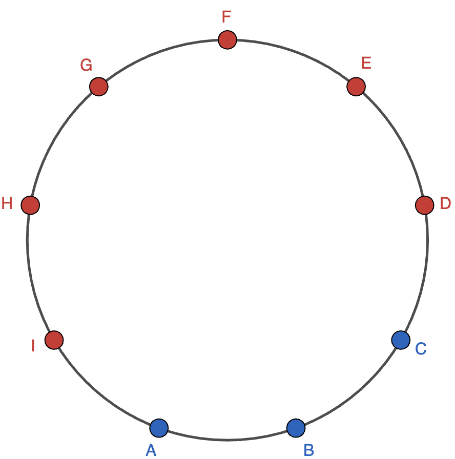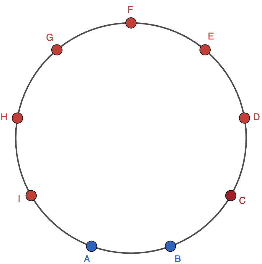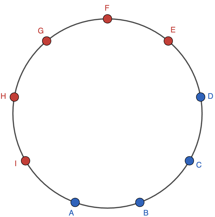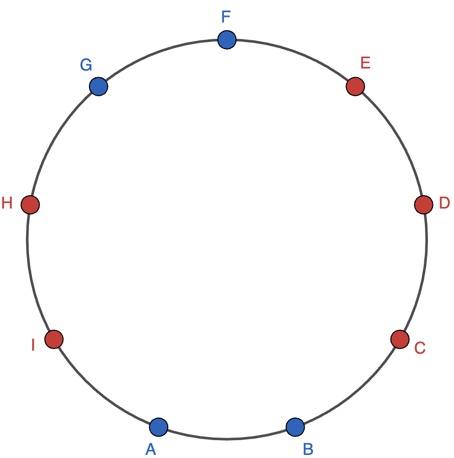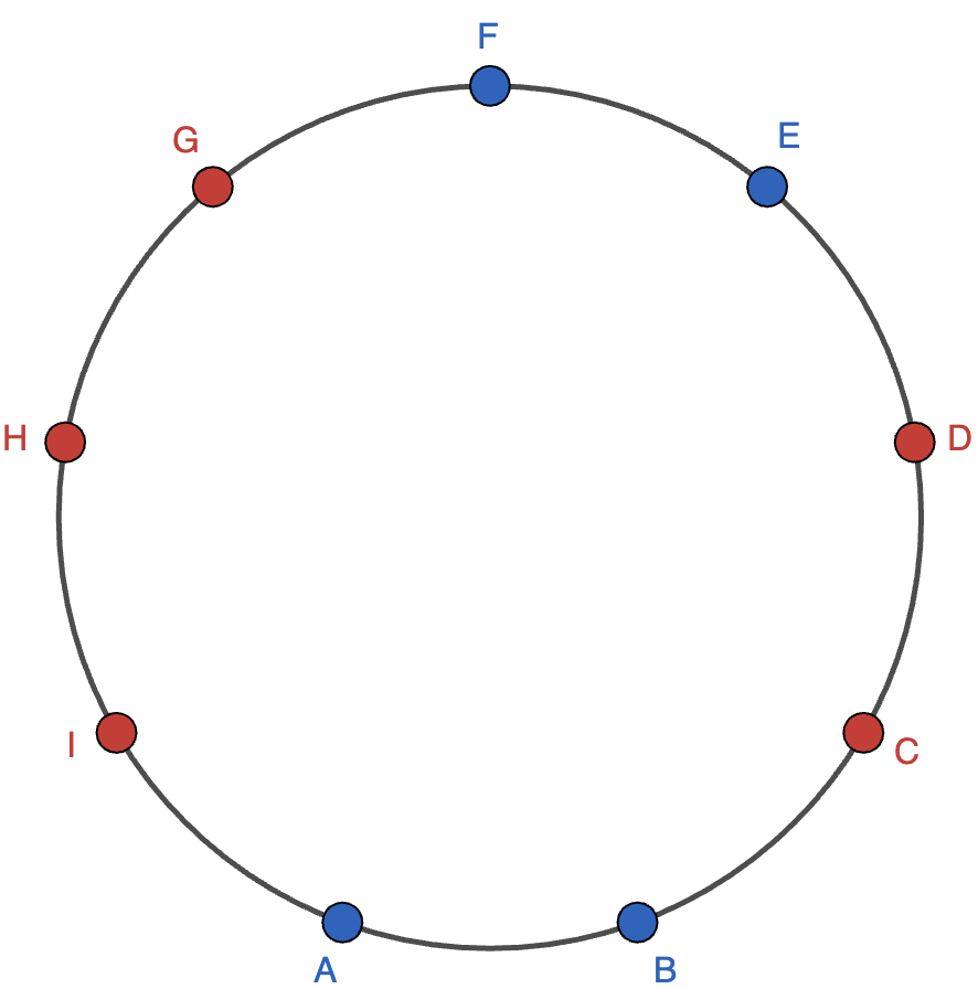 Nine light bulbs are equally spaced around a circle. When the power is turned on, each of the nine light bulbs turns blue or red, where the color of each bulb is determined randomly and independently of the colors of the other bulbs. Each time the power is turned on, the probability that the color of each bulb will be the same as at least one of the two adjacent bulbs on the circle is $\dfrac{m}{n}$, where m and n are relatively prime positive integers. Find $m+n$. (PurpleComet 2023, Middle School, Problem 20) Click here for the solutions.