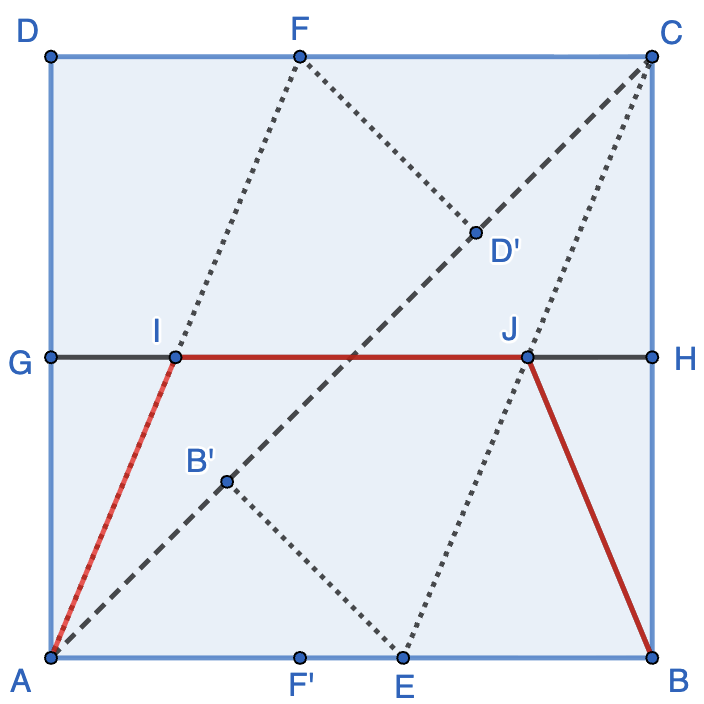 Solution: Edge $AD$ and $CB$ of unit square $ABCD$ are folded along diagonal $AC$, forming parallelogram $AECF$. Paralleogram $AECF$ is folded along $GH$, forming trapezoid $AIJB$.