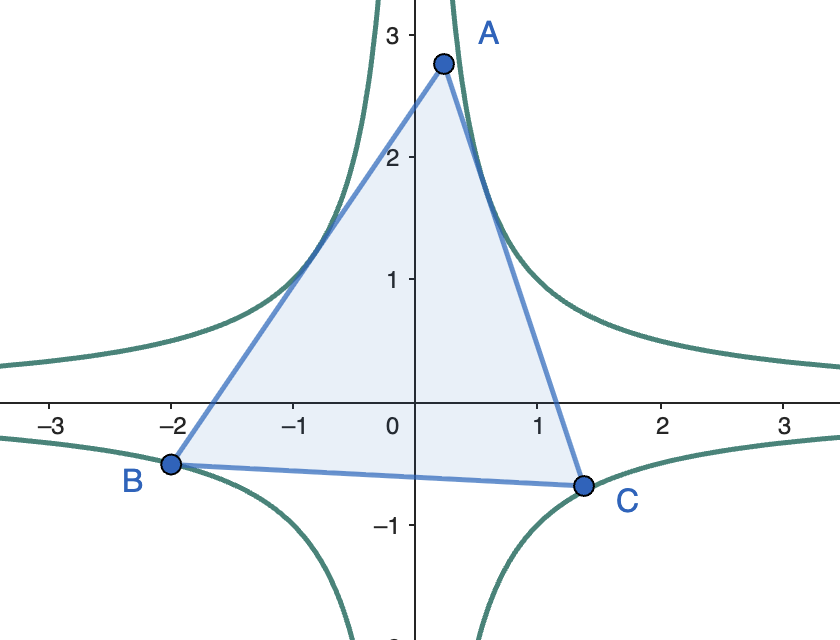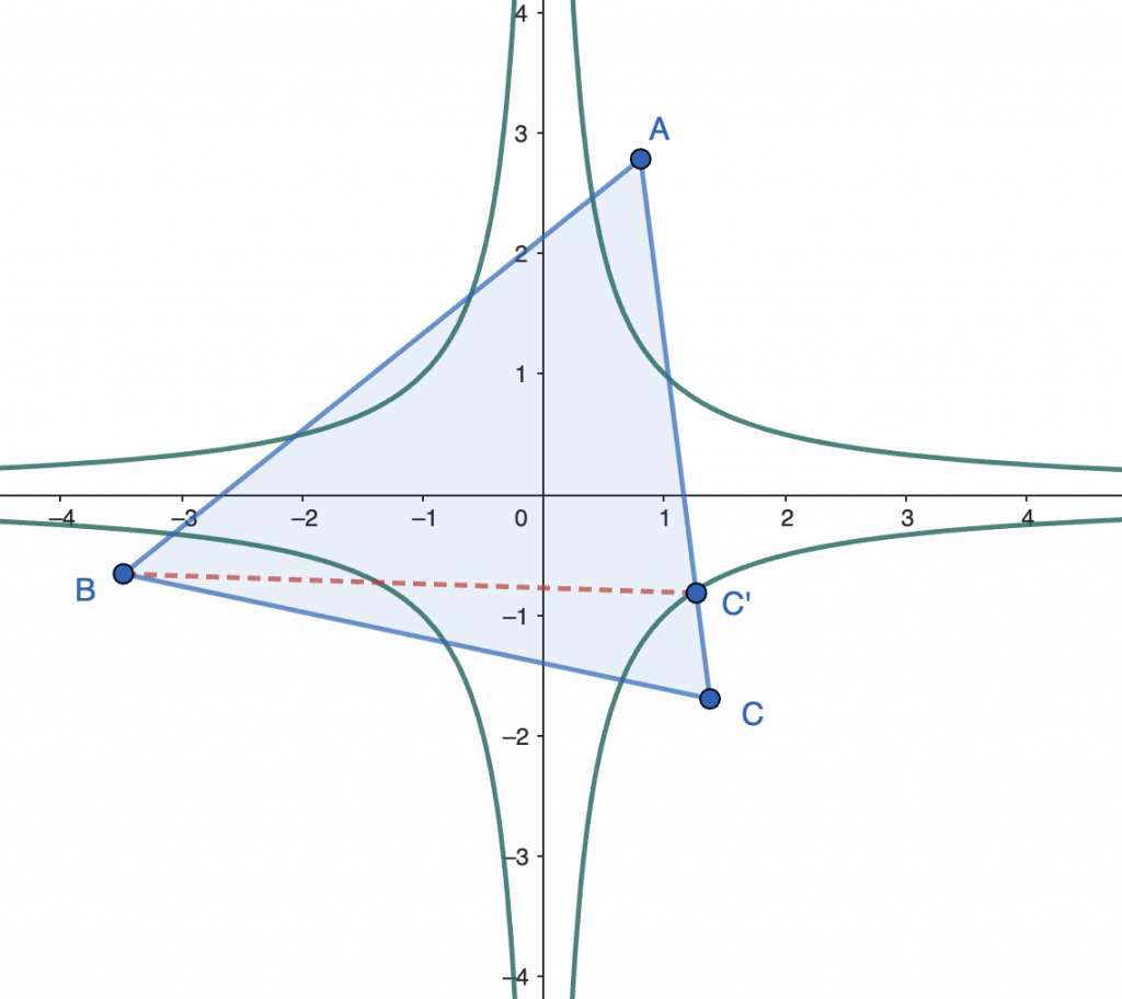 Otherwise, if any edge intersects a hyperbolas, or a vertex is outside of the interior area, a smaller triangle can be always found by moving the edge tangent to the hyperbola, or moving the vertex toward the interior region.