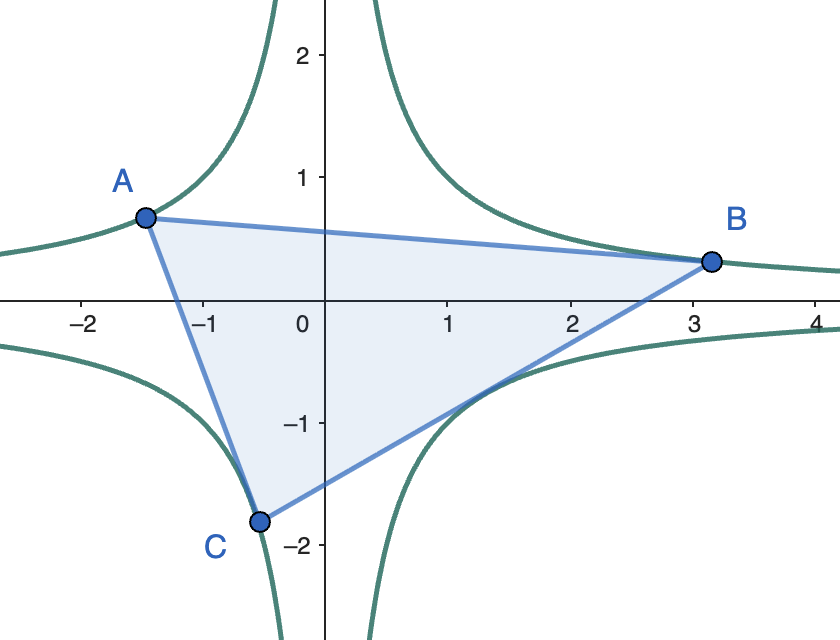 Solution: Obviously, to be the smallest triangle, the vertices of the triangle must be on the hyperbolas, or in the interior area with edges tangents to the hyperbolas, or any combinations of the above two cases.